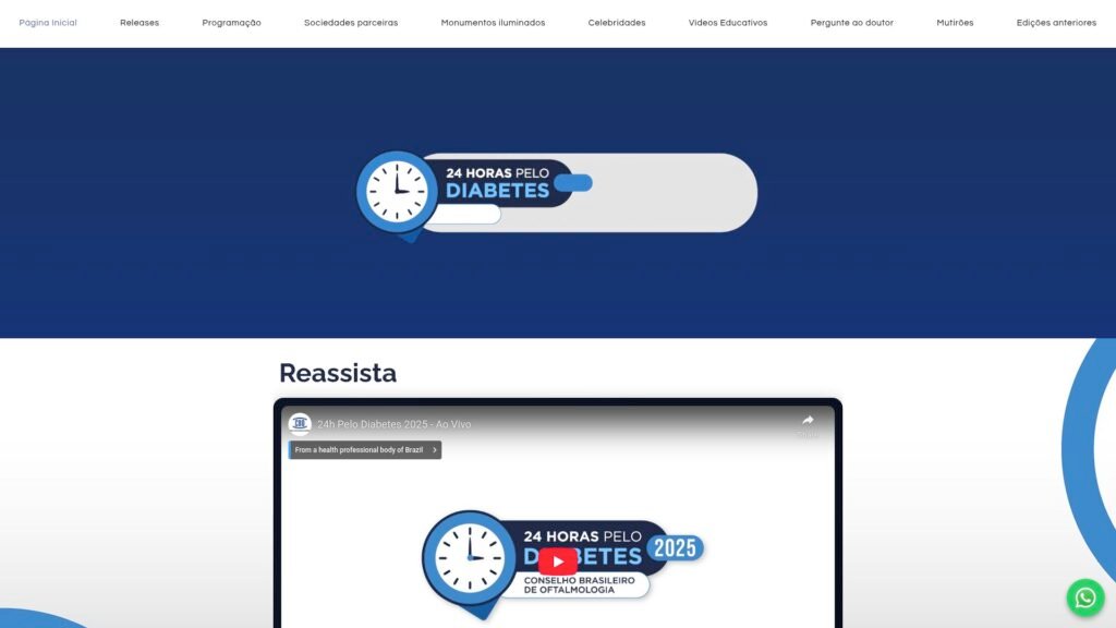 Descrição do site: Plataforma oficial da campanha “24 Horas pelo Diabetes”, uma iniciativa brasileira organizada pelo Conselho Brasileiro de Oftalmologia (CBO) com apoio de diversas sociedades médicas para promover conscientização, prevenção e cuidados relacionados ao diabetes e suas complicações, especialmente a retinopatia diabética, que pode causar perda da visão se não for monitorada e tratada precocemente. A página reúne conteúdos educativos sobre o que é diabetes, dados sobre a doença, vídeos, depoimentos e a programação de atividades como palestras, entrevistas, mutirões e debates, muitos dos quais são transmitidos ao vivo ou ficam disponíveis em formato digital para acesso público. Também há seções dedicadas a perguntas com especialistas (“Pergunte ao doutor”), sociedades parceiras e eventos anteriores, permitindo que visitantes entendam melhor a doença e como se envolver com a campanha. O design e a estrutura do site são voltados para informar pacientes, familiares, profissionais de saúde e o público em geral sobre prevenção, diagnóstico precoce e gerenciamento do diabetes, reforçando a importância de cuidados contínuos de saúde.
