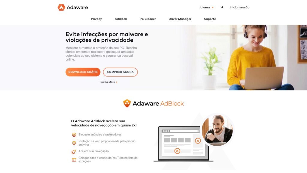 Descrição do site: O site da Adaware apresenta-se como uma plataforma dedicada à proteção digital, combinando ferramentas anti‑malware, bloqueio de anúncios, limpeza de sistema e gerenciamento de drivers. Ele oferece downloads gratuitos, ao mesmo tempo em que apresenta versões pagas com recursos adicionais para usuários que buscam proteção mais avançada. A página destaca benefícios como navegação mais rápida, bloqueio de rastreadores e alertas em tempo real sobre ameaças potenciais ao sistema. Também exibe funcionalidades de limpeza de registro, otimização de memória e descarte de arquivos inúteis, visando melhorar o desempenho do PC. O layout é moderno e direto, com chamadas para “Saiba Mais” e botões para “Download Grátis” e “Comprar Agora”. Há ainda seções institucionais como “Sobre nós”, “Política de privacidade” e “Termos de uso”, reforçando a identidade corporativa da Adaware.