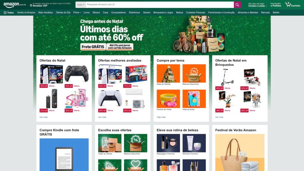 Descrição do site: O Amazon é uma gigante global de e-commerce, funcionando como um marketplace e loja online que reúne milhões de produtos em dezenas de categorias — como eletrônicos, livros, moda, casa e decoração — vendidos tanto pela própria Amazon quanto por vendedores parceiros. A plataforma combina uma ampla seleção de itens com ferramentas de busca, avaliações de clientes e várias opções de pagamento, incluindo cartão, Pix e boleto, oferecendo uma experiência de compra completa em português. Desde sua expansão no Brasil em 2019, o site tem investido em logística local com centros de distribuição e parcerias que permitem entregas rápidas, inclusive para membros do Amazon Prime, que ganham benefícios como frete grátis em muitos produtos e acesso a serviços digitais como streaming de vídeo e música. A Amazon também incentiva pequenos e médios vendedores a usar o marketplace, ampliando a diversidade de ofertas e integrando seus estoques ao sistema de logística da Amazon. A empresa enfatiza conveniência, segurança nas transações e suporte ao cliente, contando com políticas de devolução e garantia como a Garantia de A a Z para proteger consumidores. Ao navegar no site, usuários encontram promoções, categorias em destaque e recomendações personalizadas, tudo focado em facilitar a pesquisa e a compra de produtos com confiança no ambiente digital.