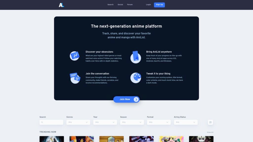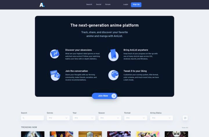 Descrição do site: O AniList é um site voltado para fãs de animes e mangás que desejam organizar, acompanhar e descobrir novas obras de forma prática e interativa. A plataforma funciona como uma espécie de rede social e banco de dados, permitindo que os usuários registrem tudo o que já assistiram ou leram, além de criar listas personalizadas com status como “assistindo”, “completo” ou “planejo ver”. O site oferece informações detalhadas sobre cada título, incluindo sinopse, datas de lançamento, gêneros, número de episódios ou capítulos e avaliações feitas pela própria comunidade. Outro destaque é o sistema de notas e reviews, onde os usuários podem avaliar obras e compartilhar opiniões, contribuindo para a descoberta de novos conteúdos. Além disso, o AniList possui uma interface moderna e ferramentas avançadas de busca e filtragem, facilitando a navegação entre milhares de animes e mangás disponíveis. A plataforma também conta com recursos sociais, como seguir outros usuários, visualizar atividades recentes e interagir por meio de comentários. Outro ponto relevante é a integração com aplicativos e APIs, permitindo que desenvolvedores e usuários utilizem seus dados em outras ferramentas e projetos. O site ainda acompanha tendências e temporadas de animes, ajudando o público a se manter atualizado com os lançamentos mais recentes. No geral, o AniList se destaca como uma plataforma completa para organização e descoberta de conteúdo otaku, combinando banco de dados, rede social e ferramentas de acompanhamento em um único ambiente dinâmico e bastante utilizado pela comunidade global.