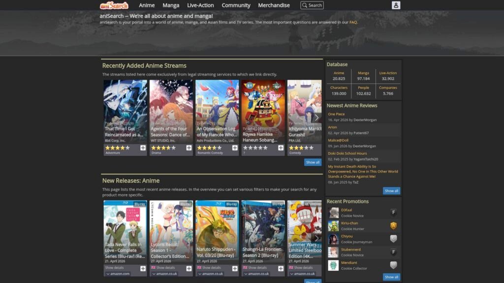 Descrição do site: O aniSearch é um site voltado para fãs de animes, mangás e produções asiáticas, funcionando como uma base de dados completa aliada a recursos de interação entre usuários. A plataforma permite pesquisar informações detalhadas sobre séries, filmes e personagens, incluindo sinopses, elenco, dados técnicos e classificações feitas pela comunidade. Além de servir como enciclopédia, o site também oferece ferramentas para organização pessoal, permitindo que os usuários criem listas com os animes que já assistiram, estão acompanhando ou pretendem ver. Esse recurso facilita o controle do consumo de conteúdo e a descoberta de novas obras com base nos interesses individuais. Outro destaque é o aspecto social da plataforma, que inclui avaliações, comentários e fóruns, incentivando a troca de opiniões e experiências entre fãs. O site também reúne conteúdos relacionados não apenas a animes e mangás, mas também a filmes e produções asiáticas em geral, ampliando seu escopo dentro do entretenimento. A navegação é estruturada para facilitar a busca e exploração de títulos, com uma interface que prioriza o acesso rápido às informações. O aniSearch possui ainda uma base consolidada ao longo dos anos, sendo ativo desde meados dos anos 2000 e contando com uma quantidade significativa de usuários e acessos mensais. No geral, o aniSearch se apresenta como uma plataforma completa para fãs de cultura japonesa, combinando banco de dados, ferramentas de organização e interação social em um único ambiente voltado à descoberta e acompanhamento de animes e mangás.