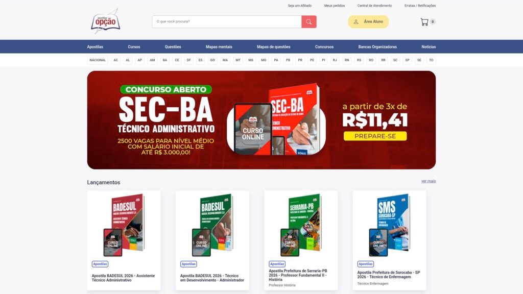 Descrição do site: O site Apostilas Opção é a plataforma digital de uma empresa brasileira tradicional no ramo de materiais didáticos para concursos públicos, oferecendo uma grande variedade de apostilas em formato impresso ou PDF voltadas à preparação de candidatos em diferentes certames e posições, com conteúdos atualizados conforme os editais. Ele apresenta seções de apostilas por estado e carreira, áreas de estudo específicas, notícias sobre concursos e ferramentas como questões e mapas mentais para apoiar a revisão dos conteúdos, além de um programa de afiliados para quem deseja comercializar os produtos. O site aposta em uma experiência de compra segura e em materiais desenvolvidos por especialistas para maximizar a eficiência nos estudos, com opções de entrega digital imediata após a confirmação do pagamento. Com décadas de atuação no mercado, a plataforma busca ser um recurso útil para concurseiros que procuram uma preparação mais estruturada e focada, integrando suporte ao cliente e informações sobre cada produto ofertado.