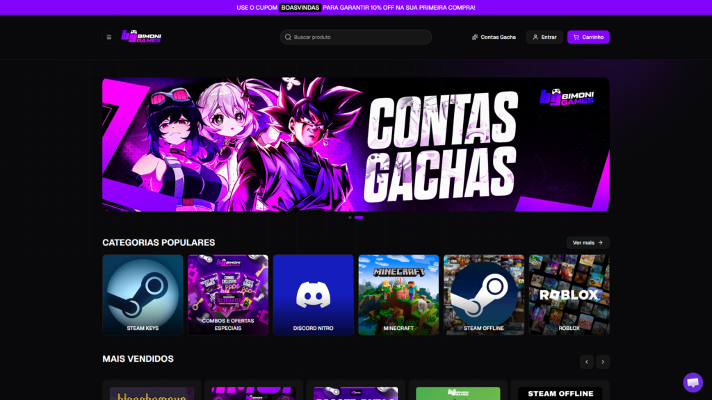 Descrição do site: O site Bimoni Games apresenta uma plataforma de comércio digital voltada à venda de chaves de jogos (game keys), especialmente para PC, com foco em produtos ativados em plataformas como Steam, Xbox e outros serviços online. A proposta do site é oferecer acesso rápido e prático a jogos e conteúdos digitais por meio da compra de códigos que são entregues automaticamente após a confirmação do pagamento. A página reúne diversas categorias de produtos, incluindo Steam Keys, combos promocionais, contas de jogos e serviços como Discord Nitro, além de conteúdos relacionados a jogos populares como Minecraft e Roblox. O ambiente também destaca ofertas com preços reduzidos e promoções frequentes, buscando atrair usuários interessados em economia na aquisição de jogos digitais. Outro ponto central da plataforma é a entrega instantânea, permitindo que o usuário receba o código logo após o pagamento, sem necessidade de envio físico. O site também afirma utilizar criptografia para proteção de dados e disponibiliza suporte ao cliente para dúvidas e problemas durante a compra. Além disso, muitos produtos funcionam no formato de chaves aleatórias, em que o usuário adquire um código sem saber previamente qual jogo será recebido, o que adiciona um elemento de surpresa à experiência. A navegação é simples e organizada por categorias, facilitando a busca por produtos específicos ou promoções em destaque. No entanto, por ser um site relativamente recente e com pouca presença em plataformas de reputação, recomenda-se atenção ao realizar compras, avaliando cuidadosamente as condições e políticas antes de adquirir produtos. Dessa forma, o site funciona como uma loja digital de games focada em praticidade e preços competitivos, voltada a jogadores que buscam adquirir jogos e conteúdos online de forma rápida.