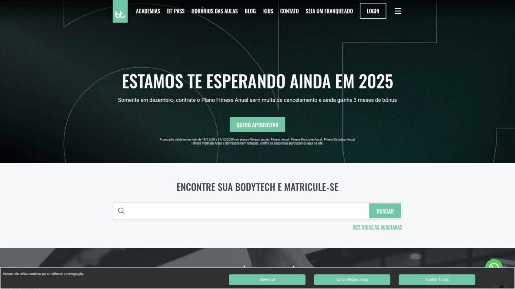 Descrição do site: Página oficial da Bodytech, uma das maiores e mais reconhecidas redes de academias premium no Brasil, dedicada a oferecer serviços completos de condicionamento físico, saúde e bem-estar com infraestrutura moderna e profissionais qualificados. A plataforma apresenta planos e modalidades de treino, destacando programas personalizados para diferentes objetivos, desde musculação e aulas coletivas até iniciativas voltadas para saúde mental, controle de peso e fortalecimento imunológico, como o programa BT Care. O site também facilita o acesso de novos e atuais alunos às informações sobre unidades, horários, planos disponíveis e ferramentas digitais, incluindo o app que integra funcionalidades como agendamento de aulas e acompanhamento de treinos. Navegando pela página, é possível conhecer a filosofia da marca que prioriza a transformação da rotina fitness em uma experiência motivadora, com suporte técnico permanente, variedade de aulas e recursos que vão além do treino tradicional. A Bodytech busca transmitir ao visitante a missão de promover vida ativa e saudável por meio de um ambiente acolhedor e serviços de alta qualidade, reforçando seu posicionamento no segmento de academias de alto padrão no país.