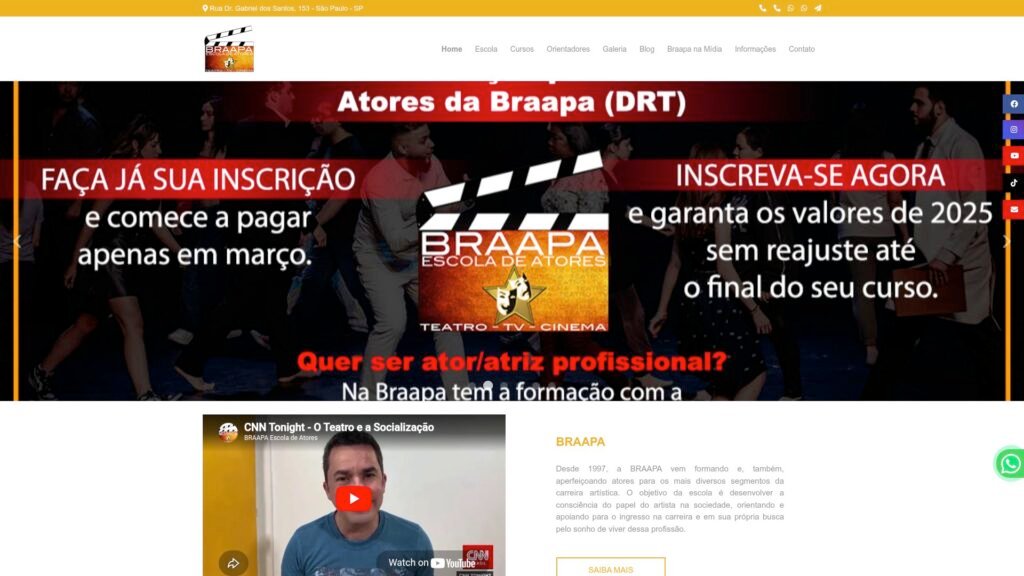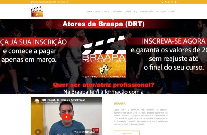 Descrição do site: O site apresenta a BRAAPA Escola de Atores, uma instituição fundada em 1997 voltada à formação e aperfeiçoamento de atores para diferentes áreas artísticas, como teatro, TV e cinema. A proposta da escola é desenvolver tanto as habilidades técnicas quanto a consciência do papel do artista na sociedade, incentivando os alunos a seguirem carreira profissional. A plataforma reúne informações sobre diversos cursos oferecidos, incluindo formação profissional com DRT, teatro livre, dublagem, clown e interpretação para TV, além de workshops e aulas de canto. Também destaca metodologias práticas, com exercícios de improvisação, expressão corporal e vocal, leitura de textos e desenvolvimento da comunicação. O site enfatiza uma abordagem dinâmica e acessível, atendendo tanto iniciantes quanto pessoas que buscam desenvolvimento pessoal e profissional. Há ainda informações de contato, localização em São Paulo e orientações para matrícula, reforçando o caráter institucional e comercial da escola. No geral, trata-se de um portal informativo e promocional que apresenta a estrutura, cursos e objetivos da BRAAPA no ensino das artes cênicas.