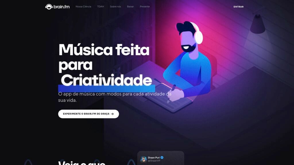 Descrição do site: O site Brain.fm apresenta uma plataforma de áudio que combina inteligência artificial e neurociência para oferecer músicas e paisagens sonoras projetadas para melhorar estados mentais específicos, como foco profundo, relaxamento, meditação e sono — tudo com base em tecnologia patenteada que modula padrões de ondas cerebrais para apoiar a concentração e o bem-estar. A página destaca como as trilhas geradas são diferentes de playlists convencionais por serem criadas para manter a atenção ou induzir descanso, sem letras e com durações longas que evitam distrações, e oferece modos adaptados a diferentes necessidades diárias. Usuários podem selecionar rapidamente o tipo de áudio que querem ouvir e experimentar os efeitos no desempenho cognitivo, produtividade ou relaxamento em poucos minutos. Brain.fm está disponível em múltiplas plataformas, incluindo web, iOS, Android e desktop, com interface intuitiva e opções de personalização conforme preferências individuais. Além disso, a página ressalta que centenas de estudos científicos e testes apoiam a eficácia do áudio para sincronizar a atividade neural, destacando resultados de pesquisas e colaborações com instituições acadêmicas. A proposta central do site é permitir que pessoas usem o som de forma consciente e orientada pela ciência para otimizar seu estado mental em diferentes contextos do dia a dia.