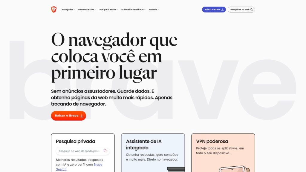 Descrição do site: O site do Brave apresenta-se como uma plataforma focada em privacidade, desempenho e autonomia do usuário na navegação. O navegador é promovido como “o navegador que coloca você em primeiro lugar”, destacando bloqueio automático de anúncios invasivos, proteção contra rastreadores e um mecanismo de busca próprio, “Brave Search”, que não cria perfil do usuário. Há também ofertas de serviços pagos, como VPN/firewall (“Brave Firewall + VPN”), carteira de ativos digitais, e um assistente de IA integrado chamado Leo. O layout é claro e moderno, com chamadas visuais fortes para download em múltiplas plataformas (computador, Android, iOS) e explicações diretas de benefícios como economia de dados, bateria e tempo. O site enfatiza que muitos dos recursos já vêm ativados por padrão, reduzindo a necessidade de configuração manual. Também há comparações com outros navegadores para mostrar onde o Brave se diferencia, além de seções de apoio com perguntas frequentes, blog, atualizações de privacidade e documentação relevante. A comunicação reforça valores de transparência e controle do usuário em vez de monetização via coleta de dados.
