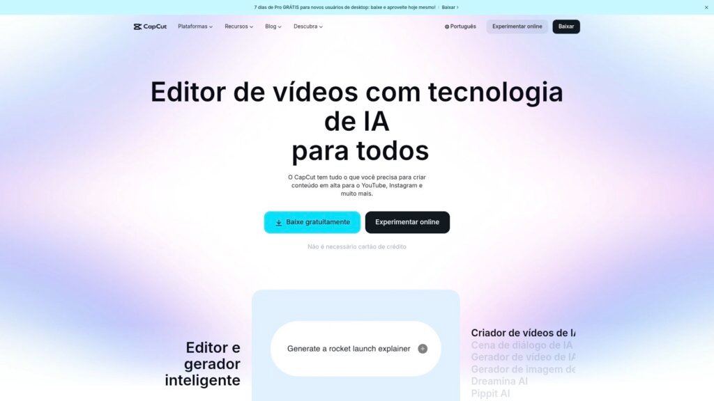 Descrição do site: O site CapCut apresenta uma plataforma completa de edição de vídeo com ferramentas inteligentes e baseadas em IA, projetada tanto para iniciantes quanto para criadores de conteúdo que querem produzir vídeos de aparência profissional para redes sociais como TikTok, Instagram e YouTube diretamente no navegador ou com download do aplicativo. Ele reúne recursos como geração automática de legendas, conversão de texto em fala, remoção de fundo, estabilização de vídeo, efeitos e filtros visuais e sonoros, além de opções avançadas de edição como transições, rastreamento de movimento e ferramentas de melhoria de imagem. A página enfatiza que todas essas funcionalidades estão acessíveis de forma intuitiva e que é possível experimentar ou baixar o editor sem precisar de cartão de crédito, com integração para uso em múltiplos dispositivos. O CapCut também oferece modelos e assistentes de IA que ajudam a criar e montar vídeos rapidamente a partir de roteiros ou conteúdo bruto, facilitando o fluxo criativo para influenciadores, profissionais de marketing e usuários casuais. A proposta central do site é tornar a edição de vídeo rápida, poderosa e acessível, combinando tecnologia de ponta e uma interface amigável que atende tanto a projetos simples quanto a produções mais complexas.