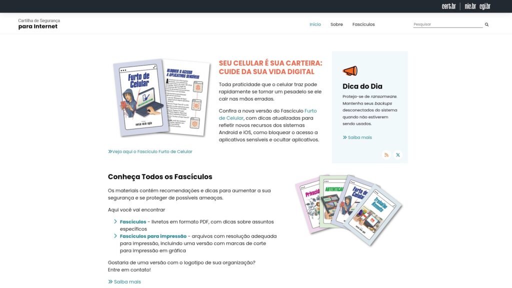 Descrição do site: O site Cartilha de Segurança para Internet funciona como uma referência educativa e gratuita voltada à segurança no uso da internet. Ele reúne uma série de “fascículos” em PDF — prontos para download — que explicam de forma clara e acessível os principais riscos do ambiente digital e oferecem recomendações de boas práticas para proteger dados, dispositivos, contas e privacidade. Também disponibiliza um “livro” completo em PDF/ePub, com capítulos mais aprofundados sobre os vários aspectos da segurança na web, desde senhas e redes sociais até ameaças como malware e phishing. O conteúdo foi desenvolvido pelo CERT.br — o centro de resposta a incidentes e segurança da informação do Brasil — em colaboração com o NIC.br (entidade ligada ao CGI.br). A proposta é tornar o uso da internet mais consciente e seguro, combinando explicações de conceitos e orientações práticas que ajudam desde usuários domésticos até instituições escolares ou empresas. Como o material está sob licença Creative Commons, pode ser livremente compartilhado e usado em contextos de educação ou conscientização. O site varia entre guias técnicos e linguagem acessível, o que o torna útil tanto para quem tem pouco familiaridade com tecnologia quanto para quem deseja aprofundar seus conhecimentos sobre segurança digital. Em resumo, a Cartilha funciona como um guia confiável e abrangente para orientar o público brasileiro sobre como navegar na internet com segurança, protegendo-se de ameaças e facilitando o uso consciente e informado da rede.