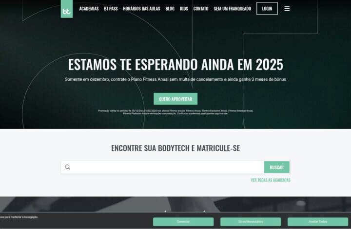 Descrição do site: Página oficial da Bodytech, uma das maiores e mais reconhecidas redes de academias premium no Brasil, dedicada a oferecer serviços completos de condicionamento físico, saúde e bem-estar com infraestrutura moderna e profissionais qualificados. A plataforma apresenta planos e modalidades de treino, destacando programas personalizados para diferentes objetivos, desde musculação e aulas coletivas até iniciativas voltadas para saúde mental, controle de peso e fortalecimento imunológico, como o programa BT Care. O site também facilita o acesso de novos e atuais alunos às informações sobre unidades, horários, planos disponíveis e ferramentas digitais, incluindo o app que integra funcionalidades como agendamento de aulas e acompanhamento de treinos. Navegando pela página, é possível conhecer a filosofia da marca que prioriza a transformação da rotina fitness em uma experiência motivadora, com suporte técnico permanente, variedade de aulas e recursos que vão além do treino tradicional. A Bodytech busca transmitir ao visitante a missão de promover vida ativa e saudável por meio de um ambiente acolhedor e serviços de alta qualidade, reforçando seu posicionamento no segmento de academias de alto padrão no país.