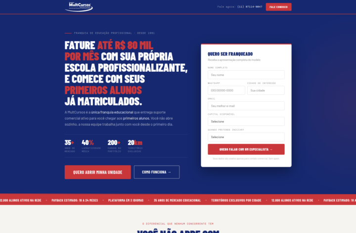 Descrição do site: O site Franquia MultCursos apresenta uma proposta voltada ao empreendedorismo no setor educacional, oferecendo a oportunidade de investimento em uma rede de cursos profissionalizantes já estruturada. A página destaca o potencial de crescimento do mercado de educação no Brasil, posicionando-o como um segmento promissor para quem deseja abrir o próprio negócio. A proposta da franquia está baseada em um modelo que combina ensino presencial e online, com metodologia própria e foco na capacitação prática de alunos de diferentes perfis, desde jovens até adultos em busca de qualificação profissional. O site enfatiza que o franqueado recebe suporte completo, incluindo treinamento, orientação operacional e acesso a uma estrutura já testada no mercado, o que reduz parte das dificuldades comuns de iniciar um negócio do zero. Também são apresentados os requisitos desejados para o investidor, como perfil empreendedor, afinidade com a área educacional e capacidade de investimento, além da importância do envolvimento ativo na gestão da unidade. Outro ponto relevante é a variedade de cursos oferecidos pela rede, abrangendo áreas como informática, gestão, idiomas e preparatórios, o que amplia o público-alvo e as possibilidades de receita da franquia. De forma geral, o site posiciona a MultCursos como uma opção acessível para quem deseja empreender na educação, combinando modelo de negócio estruturado, suporte contínuo e foco na empregabilidade dos alunos como diferencial competitivo.