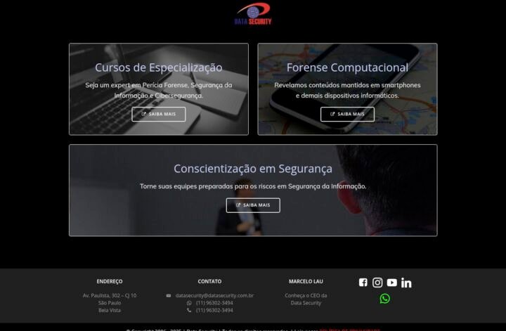 Descrição do site: O site Data Security é focado em oferecer soluções completas para a segurança da informação, com serviços especializados em proteção de dados e cibersegurança. A plataforma oferece consultoria, auditoria, e gestão de riscos, além de serviços de monitoramento contínuo para identificar e mitigar vulnerabilidades em sistemas e redes. O site destaca a importância da conformidade com normas e regulamentações, como a LGPD e a GDPR, ajudando empresas a protegerem suas informações sensíveis. Com um design direto e funcional, a Data Security também oferece treinamentos e workshops para capacitar equipes em práticas de segurança digital. Seu objetivo é proporcionar às empresas uma abordagem estratégica e eficaz contra ameaças cibernéticas, garantindo a integridade e a confidencialidade dos dados.