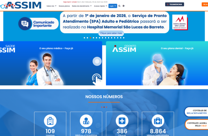 Descrição do site: O site da Assim Saúde apresenta uma visão institucional e operacional da empresa, destacando sua atuação como operadora de planos de saúde com forte presença no estado do Rio de Janeiro. A página reúne informações sobre os serviços oferecidos, incluindo planos médicos e odontológicos voltados para pessoas físicas e empresas. Também evidencia a ampla rede própria e credenciada, composta por hospitais, clínicas, laboratórios e profissionais de diversas especialidades. O portal disponibiliza recursos úteis como agência virtual, emissão de segunda via de boletos e acesso a dados contratuais, facilitando o relacionamento com clientes. Além disso, há destaque para canais de atendimento, inclusive digitais, como WhatsApp e aplicativo próprio. O site reforça o compromisso com a qualidade do atendimento e a humanização dos serviços prestados. Informações institucionais mostram que a empresa foi fundada em 1988 e atende centenas de milhares de beneficiários na região . Também são apresentados programas de saúde preventiva e iniciativas voltadas ao bem-estar dos clientes. A estrutura da página busca ser funcional, reunindo conteúdos informativos e serviços em um único ambiente. Dessa forma, o site atua como um canal completo de suporte, informação e relacionamento com os usuários.