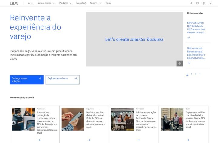 Descrição do site: O site da IBM apresenta soluções de tecnologia sofisticadas para empresas de todos os portes. A plataforma destaca ofertas em inteligência artificial, nuvem híbrida, automação e segurança, reforçando a posição da IBM como parceira estratégica para a transformação digital. Há também informações sobre consultoria da IBM Consulting, voltada para modernização de negócios e inovação. No site, desenvolvedores podem acessar recursos para aprendizado e experimentação com IA, APIs, modelos e conjuntos de dados. A IBM enfatiza seu compromisso com a tecnologia responsável, promovendo governança de dados e ética no uso da IA. A parte institucional mostra a história da empresa, seus laboratórios de pesquisa e a visão de impactar positivamente a sociedade. Além disso, há conteúdo sobre sustentabilidade e iniciativas globais para tornar a tecnologia mais inclusiva. Por fim, o portal oferece notícias sobre parcerias, estudos de mercado e eventos da IBM, conectando executivos, clientes e comunidade técnica.