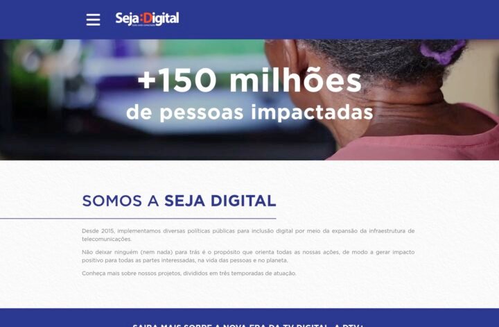 Descrição do site: O site Seja Digital funciona como o portal oficial de uma instituição sem fins lucrativos criada para promover a inclusão digital e a migração do sinal de TV analógico para o digital no Brasil. Ele explica com clareza sua missão original e os projetos realizados desde 2015, mostrando como o processo atendeu milhões de brasileiros, garantindo acesso à TV digital e promovendo expansão de conectividade. O site traz informações sobre as diferentes etapas do projeto ― como distribuição de kits conversores para famílias de baixa renda ― e detalhes sobre abrangência geográfica, histórico e resultados obtidos. Também publica relatórios, dados de impacto social, ações voltadas à inclusão e documentação institucional que retrata a trajetória da entidade e seus objetivos. Mais recentemente, o portal passou a documentar novos esforços de inclusão digital, como a expansão de banda larga móvel e acesso à internet em regiões remotas — reforçando seu papel social e compromisso com conectar pessoas. A linguagem utilizada no site é acessível e institucional, voltada ao cidadão comum, gestores públicos e interessados nas políticas de telecomunicações. Em suma, a Seja Digital utiliza esse portal para divulgar suas campanhas e iniciativas de inclusão, funcionar como fonte de transparência institucional e informar a população sobre como participar ou se beneficiar dessas ações.