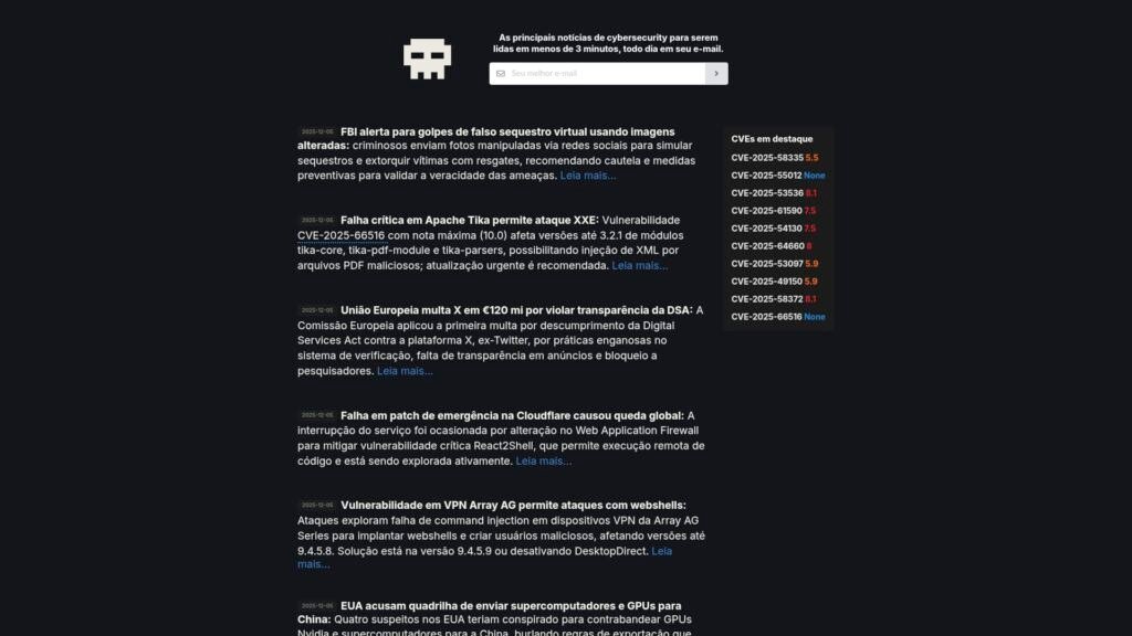 Descrição do site: O site CaveiraTech se posiciona como um portal dedicado a notícias e atualizações sobre cibersegurança, vulnerabilidades e hacking. Sua proposta é entregar alertas sobre falhas graves, ataques recentes e decisões relevantes de segurança digital em formato direto e de leitura rápida — ideal para quem quer se manter informado sem perder tempo. Além das notícias, o site oferece uma newsletter diária para quem quiser receber os principais destaques por e-mail. A linguagem costuma equilibrar um tom técnico com acessibilidade, tornando o conteúdo compreensível tanto para profissionais da área quanto para leitores com interesse geral em segurança digital. Nesse aspecto, serve tanto como fonte de alerta para administradores e técnicos quanto como meio de conscientização para usuários que buscam se proteger online. Em resumo, o CaveiraTech funciona como uma “central de notícias e alertas” sobre ameaças, vulnerabilidades e atualidades da cibersegurança — um recurso útil para acompanhar o ritmo acelerado do mundo digital.