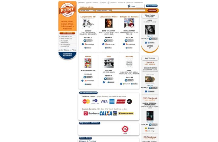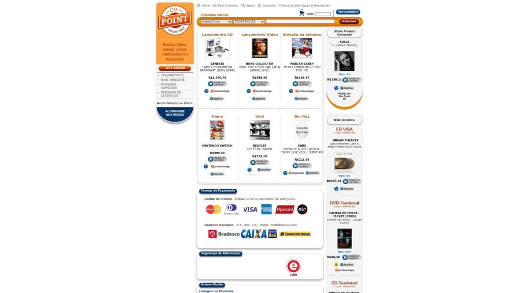 Descrição do site: O site CD Point é uma loja online brasileira especializada na venda de mídias físicas e itens de entretenimento, como CDs de música, DVDs e Blu-Rays de filmes, jogos, vinis, livros e artigos colecionáveis, com categorias organizadas por lançamentos, mais vendidos e pesquisas avançadas para facilitar a busca. A página permite pesquisa por artista, título ou formato e apresenta produtos com preços e opções de pagamento como cartão de crédito, boleto bancário ou depósito. Além disso, o site oferece funcionalidades típicas de e-commerce, como acompanhamento de pedido, cadastro de usuário, política de devolução e contato para suporte. A plataforma existe desde a década de 1990 e pertence à empresa TORG Comércio e Participações Ltda., com endereço no Rio de Janeiro, embora a reputação online não seja amplamente registrada em sites de avaliação de consumidores. A navegação tem visual clássico e foca em colecionadores e amantes de mídias físicas, exibindo capas de produtos e categorias variadas diretamente na página inicial. No geral, o site se apresenta como uma alternativa para quem busca comprar mídias tradicionais e itens relacionados à cultura pop e musical com organização por categorias e filtros de pesquisa.