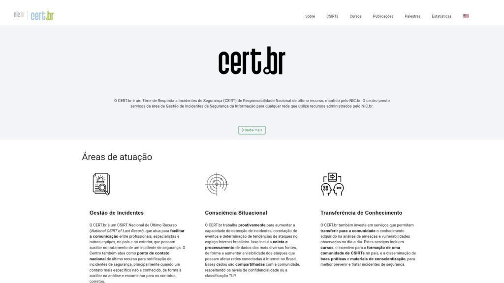 Descrição do site: O site CERT apresenta-se como o portal oficial do principal centro de resposta a incidentes de segurança da informação no Brasil, responsável por coordenar a detecção, notificação e mitigação de ataques e vulnerabilidades em redes que utilizam recursos registrados sob o domínio “.br” ou endereços IP/ASNs alocados ao Brasil. No site, encontram-se informações sobre a missão institucional do CERT — aumentar a segurança e a capacidade de resposta a incidentes na internet brasileira — e seus serviços principais: gestão de incidentes, monitoramento de ameaças (consciência situacional) e a disseminação de conhecimento técnico e educativo. Há também publicações acessíveis ao público em geral, como guias, relatórios e estatísticas sobre incidentes, vulnerabilidades, spam, phishing e outros tipos de ameaças. Além disso, o site oferece material educativo — inclusive voltado a usuários domésticos, empresas, escolas e instituições — com recomendações para uso seguro da internet, prevenção de ataques e boas práticas de segurança digital. O CERT também promove treinamentos e apoio à formação de novos grupos de resposta a incidentes (CSIRTs), incentivando a cooperação nacional e internacional para fortalecer a segurança coletiva da internet no Brasil. Em síntese, o portal do CERT funciona como referência confiável e centralizada para quem busca entender, prevenir e reagir a ameaças cibernéticas no Brasil, unindo ação técnica, informação aberta e educação para fomentar uma internet mais segura no país.