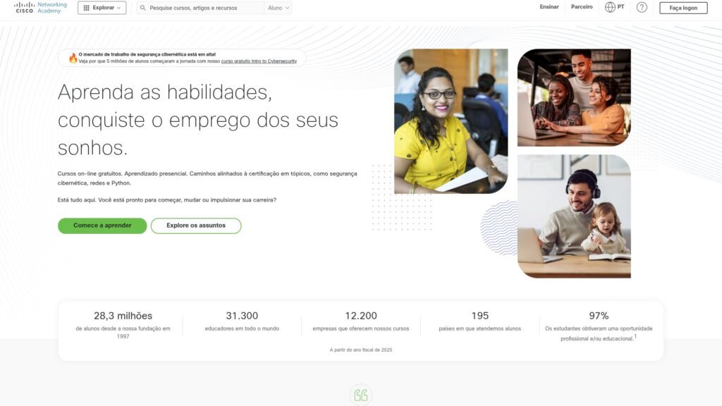 Descrição do site: O site Cisco Networking Academy é uma plataforma de educação online voltada para o ensino de tecnologias de redes e cibersegurança, desenvolvida pela Cisco. Ele oferece cursos e treinamentos que preparam os alunos para uma variedade de certificações profissionais, como a CCNA, além de proporcionar conteúdos sobre administração de redes, programação e IoT. O portal é projetado para atender tanto iniciantes quanto profissionais em busca de aprimoramento, com uma abordagem prática e interativa. Os cursos são estruturados em módulos, com recursos como simuladores de redes e exercícios hands-on. A plataforma também facilita o acesso a uma comunidade global de estudantes e instrutores, permitindo a troca de conhecimentos e experiências.