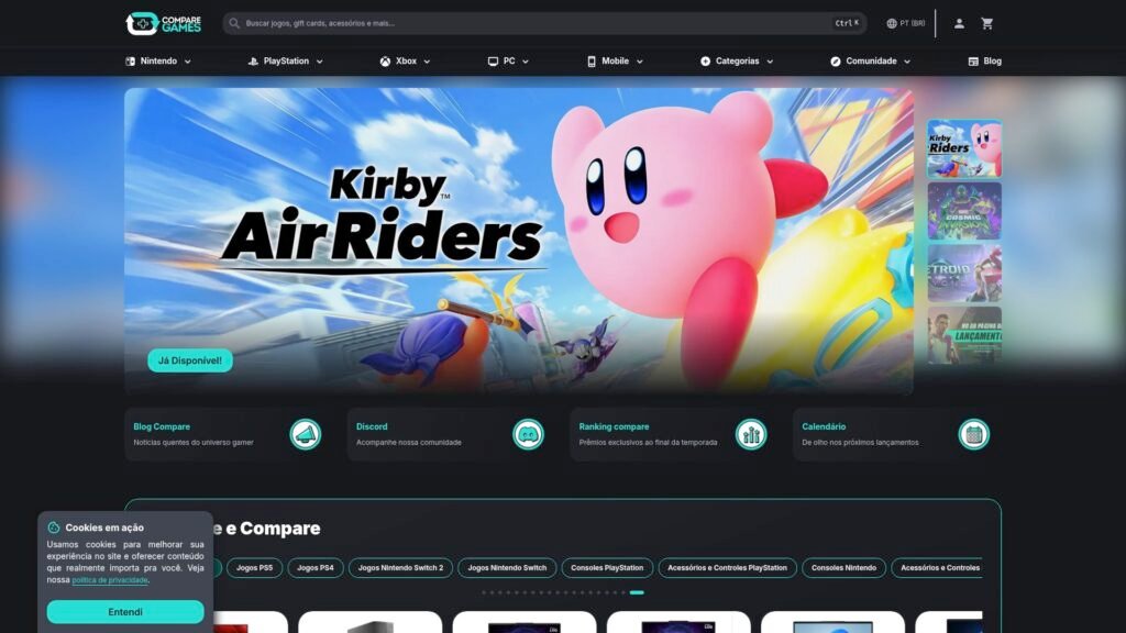 Descrição do site: O site Compare Games funciona como uma plataforma brasileira voltada ao público gamer, com foco na comparação de preços e também na venda de produtos digitais relacionados a jogos. A proposta principal é ajudar os usuários a encontrar as melhores ofertas disponíveis no mercado, reunindo jogos, consoles, acessórios e itens para PC em um só lugar. Além do comparador, o site também atua como loja, oferecendo jogos digitais, gift cards e licenças que podem ser ativadas nas plataformas oficiais. A interface organiza os produtos por categorias, como PlayStation, Xbox, Nintendo e hardware para computador, facilitando a navegação e a busca por itens específicos. Também há destaque para promoções e jogos populares, com preços competitivos e possibilidade de adicionar produtos ao carrinho diretamente. O site inclui ainda conteúdos complementares, como notícias do universo gamer, biblioteca de jogos e recursos de conta, como lista de desejos e acompanhamento de favoritos. Outro aspecto relevante é o histórico da plataforma, que surgiu inicialmente como um comparador de preços e portal de conteúdo, sendo posteriormente reformulada para incluir funcionalidades mais amplas, como venda direta e maior interatividade. O site também disponibiliza suporte ao usuário, com canais de atendimento e seções de ajuda para orientar compras e uso dos serviços. De forma geral, o Compare Games se posiciona como um hub gamer que combina comparação de preços, loja digital e conteúdo informativo, buscando oferecer praticidade e economia para jogadores que desejam adquirir jogos e produtos relacionados.