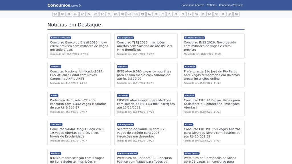 Descrição do site: O site Concursos funciona como um agregador e portal de notícias focado em concursos públicos no Brasil, reunindo editais, processos seletivos, concursos previstos e atualizações relevantes para quem busca vaga no serviço público. Ele publica listas de concursos abertos e previstos, com informações sobre cargos, salários, níveis de escolaridade e órgãos responsáveis — permitindo que o usuário consulte de maneira relativamente ampla e atualizada quais oportunidades estão disponíveis. A página traz também notícias e reportagens sobre mudanças em concursos públicos, decisões de órgãos, nomeações e prazos, ajudando a contextualizar o panorama de concursos no país. O site permite que o visitante receba alertas por e-mail sobre novos concursos, o que facilita a rotina de quem está em busca de oportunidades. Apesar de existir há várias décadas, há ressalvas sobre sua infraestrutura técnica: segundo análises independentes, o site não possui um selo de segurança HTTPS/SSL válido atualmente, o que exige cuidado — especialmente ao informar dados pessoais. Também não há um histórico consolidado de reputação de atendimento ao usuário nas plataformas de reclamação: o registro público indica poucas reclamações, mas nenhuma resposta da equipe do site. Em resumo, Concursos serve como uma fonte de referência útil para acompanhar editais e notícias sobre concursos públicos em todo o Brasil, mas recomenda-se que o usuário verifique diretamente os editais oficiais e evite enviar dados sensíveis sem confirmar a autenticidade da fonte.