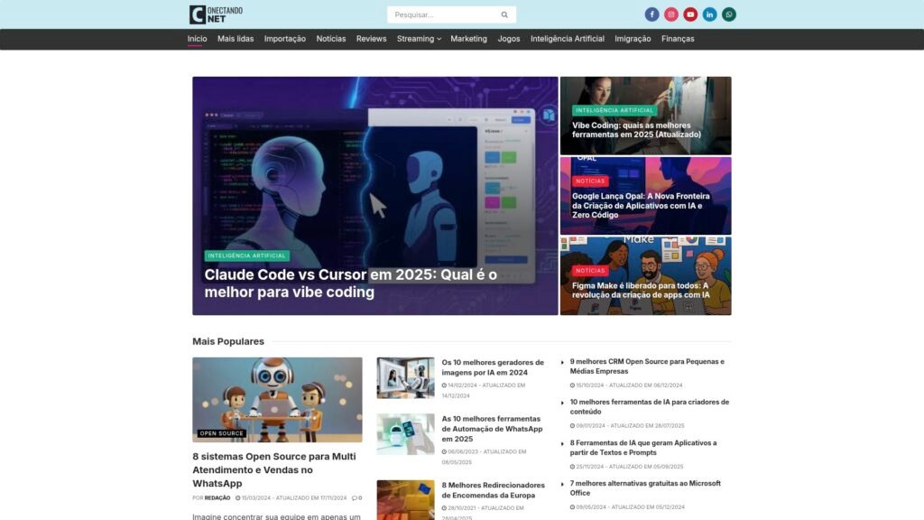 Descrição do site: O site Conectando Net é um portal focado em tecnologia, importação e inteligência artificial, oferecendo conteúdo acessível e informativo para entusiastas e profissionais da área. Nele, o leitor encontra artigos sobre ferramentas No-Code, sistemas open source, dicas de IA, bem como tutoriais e notícias relevantes sobre inovação. A plataforma nasceu como uma agência de desenvolvimento web e consultoria, mas evoluiu para um blog sólido que prioriza transparência, segurança e qualidade editorial. Segundo a página “Quem Somos”, todo o conteúdo é produzido manualmente, sem automação, e há um compromisso sério com a proteção de dados dos visitantes. Além disso, o site publica frequentemente listas de “mais lidas”, destacando os temas mais populares entre sua audiência. Há uma política de privacidade clara, explicando o uso de cookies e a forma como dados dos usuários são tratados. O blog também conta com uma newsletter, permitindo que os leitores recebam novidades direto no e-mail. No geral, o Conectando Net se posiciona como uma fonte confiável de conhecimento tecnológico, combinando análise prática com visão estratégica sobre tendências emergentes.