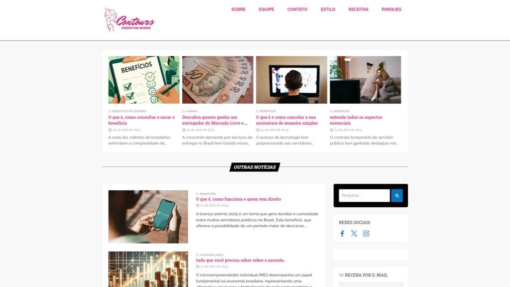 Descrição do site: O site da Contours, que é uma rede de academias femininas voltada especialmente para o público feminino que busca condicionamento físico, bem-estar e qualidade de vida em um ambiente dedicado somente a mulheres, com foco em treinos funcionais, circuitos de exercícios e aulas variadas adaptadas às necessidades delas. A plataforma reflete a proposta da marca de oferecer treinos eficientes e dinâmicos, muitas vezes com métodos de circuito de cerca de 30 minutos que combinam musculação e exercícios funcionais num formato prático para rotinas atarefadas, além de possíveis serviços complementares como aulas de pilates, zumba ou acompanhamento nutricional, dependendo da unidade. A Contours é uma franquia internacional presente em várias cidades do Brasil, com diversas unidades espalhadas em bairros de São Paulo e outras capitais, todas focadas em criar um espaço seguro e motivador para mulheres cuidarem de sua saúde física. A intimidade e o conforto de treinar apenas entre mulheres, sem presença masculina na academia, é um dos pontos que a marca realça em sua comunicação e filosofia de atendimento, reforçando a ideia de comunidade e apoio ao estilo de vida ativo feminino.