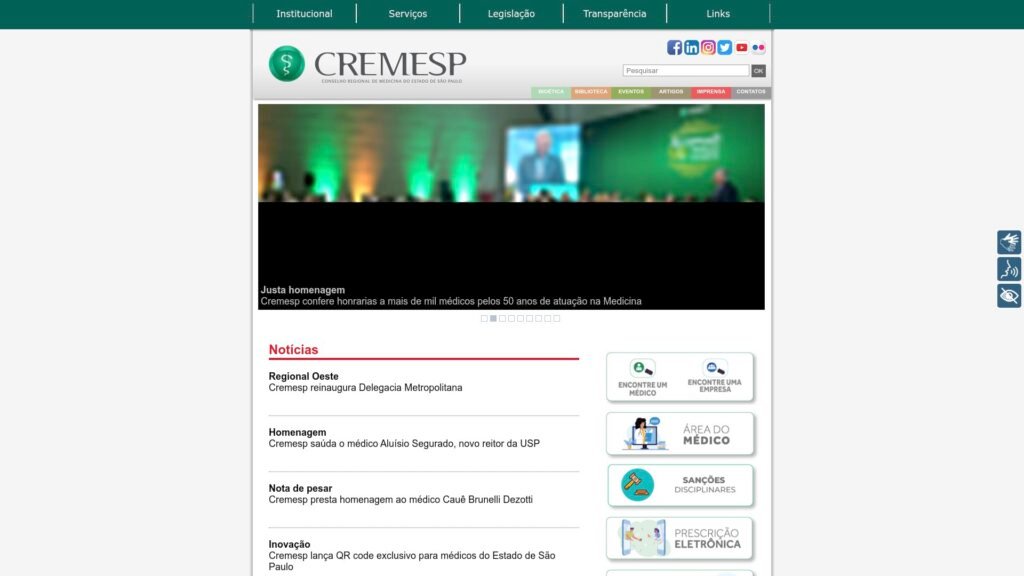 Descrição do site: O site CREMESP é o portal oficial do Conselho Regional de Medicina do Estado de São Paulo, responsável pela fiscalização e normatização do exercício da medicina no estado. A plataforma reúne informações institucionais, notícias, resoluções e comunicados voltados a médicos e à sociedade. Por meio do site, é possível consultar o registro profissional de médicos, acessar serviços online, emitir documentos e acompanhar processos éticos. O portal também divulga eventos, cursos, publicações e orientações técnicas relacionadas à prática médica. A navegação é organizada e voltada à transparência, seguindo padrões de órgãos públicos e entidades de classe. O site oferece ainda conteúdos educativos sobre ética médica e defesa da boa prática profissional. É uma fonte oficial e confiável para informações sobre o exercício da medicina em São Paulo.