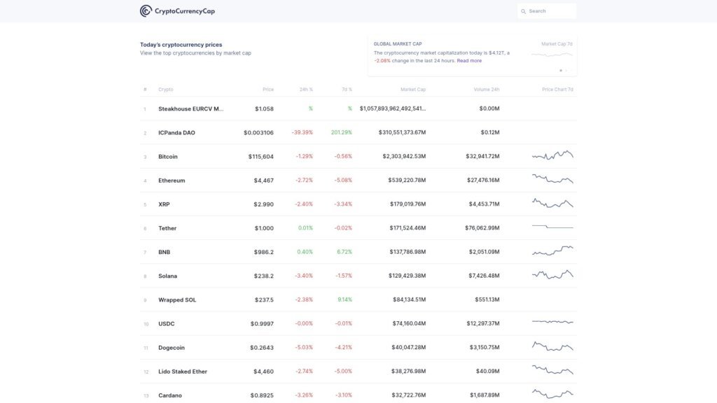 Descrição do site: O site CryptoCurrencyCap serve como um painel de consulta rápida para o mercado de criptomoedas, mostrando preços, volume negociado e capitalização de mercado em tempo real. Ele exibe um ranking das criptos mais importantes, destacando variações de 24h e 7 dias, além de gráficos que facilitam a visualização das tendências recentes. O visual é claro e direto, com informações como dominância de mercado (por exemplo, do Bitcoin) e as maiores altas e baixas no período. Não há excesso de conteúdo editorial: o foco é oferecer dados consistentes e atualizados, com poucas distrações. Também disponibiliza estatísticas agregadas globais, como volume total negociado e valor de mercado somado. As funcionalidades são ideais para quem quer monitorar de forma simples e eficiente o andamento do mercado cripto, sem complexidade ou análise aprofundada.