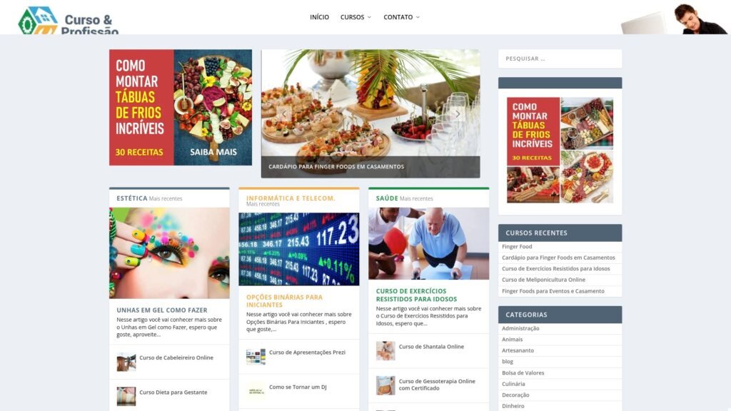 Descrição do site: O site Curso e Profissão é um portal online voltado à oferta e divulgação de cursos livres em diversas áreas, com foco em capacitação prática e rápida para o mercado de trabalho. A plataforma reúne uma grande variedade de conteúdos educacionais, abrangendo temas como saúde, estética, culinária, informática, administração e desenvolvimento pessoal. O site apresenta tanto cursos completos quanto conteúdos informativos e tutoriais, como receitas, técnicas artesanais e orientações profissionais, o que amplia seu alcance para diferentes perfis de usuários. A proposta é permitir que qualquer pessoa aprenda novas habilidades de forma acessível, muitas vezes com certificação ao final. A navegação é organizada por categorias e publicações recentes, facilitando a busca por temas específicos e tendências de aprendizado. Também há destaque para cursos voltados à geração de renda, empreendedorismo e atividades autônomas, reforçando o caráter prático da plataforma. De modo geral, trata-se de um site com enfoque educacional e profissionalizante, que combina conteúdos de aprendizado com oportunidades de qualificação online, atendendo tanto iniciantes quanto pessoas que desejam se reinventar ou complementar sua formação.