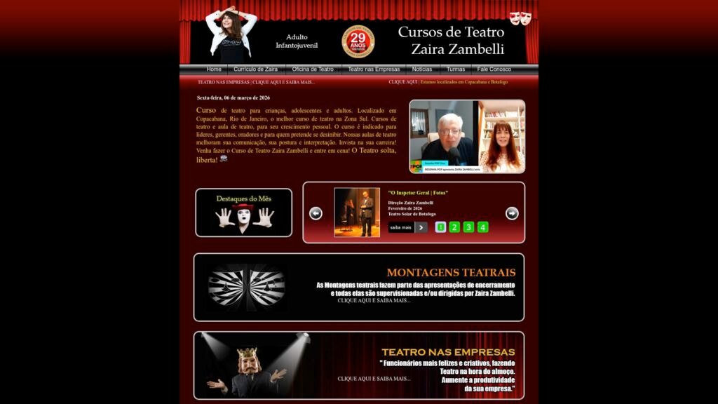 Descrição do site: O site Cursos de Teatro Zaira Zambelli é uma plataforma voltada à divulgação de cursos e materiais relacionados às artes cênicas e à formação de atores. A página apresenta informações sobre programas de aprendizado destinados a pessoas interessadas em desenvolver habilidades de interpretação, expressão corporal e comunicação no palco. O conteúdo do site aborda técnicas de atuação, improvisação, construção de personagens, dicção e outras práticas utilizadas no teatro. A proposta é oferecer orientação para iniciantes que desejam conhecer o universo teatral, bem como para quem busca aperfeiçoar suas capacidades artísticas. O portal também reúne explicações sobre o funcionamento de cursos de teatro, seus benefícios e possíveis aplicações profissionais ou pessoais. Em muitos casos, o aprendizado teatral é apresentado como uma forma de desenvolver criatividade, autoconfiança e capacidade de comunicação. O site está ligado à empresa Braapa Produções Artísticas e Publicidade Ltda., responsável pelo domínio registrado há mais de duas décadas. Dessa forma, a página funciona como um espaço informativo e de divulgação voltado a quem deseja aprender mais sobre teatro e participar de cursos na área de artes cênicas.
