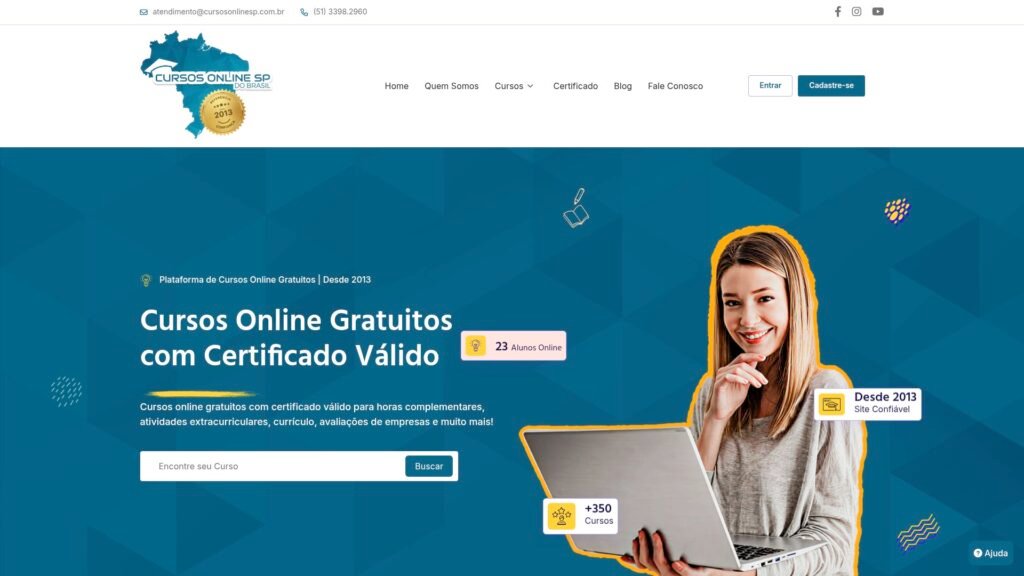 Descrição do site: O site Cursos Online SP oferece uma plataforma de cursos profissionalizantes e de qualificação em diversas áreas, com foco no desenvolvimento de habilidades práticas e acessíveis. Ele disponibiliza cursos em modalidades como administração, saúde, estética, gastronomia, informática, entre outros, visando atender tanto iniciantes quanto profissionais em busca de aprimoramento. A proposta é facilitar o acesso ao aprendizado com a flexibilidade do ensino a distância, permitindo que o aluno se capacite de acordo com seu próprio ritmo. Os cursos são voltados a uma preparação rápida para o mercado de trabalho, oferecendo conteúdos relevantes e atualizados. A plataforma também destaca a possibilidade de obter certificados ao concluir as formações, o que agrega valor ao currículo do estudante. Além disso, o site é estruturado de forma clara e intuitiva, permitindo fácil navegação entre as opções e categorias de cursos. No geral, o Cursos Online SP busca ser uma ferramenta eficiente para quem deseja melhorar ou adquirir novas competências profissionais.