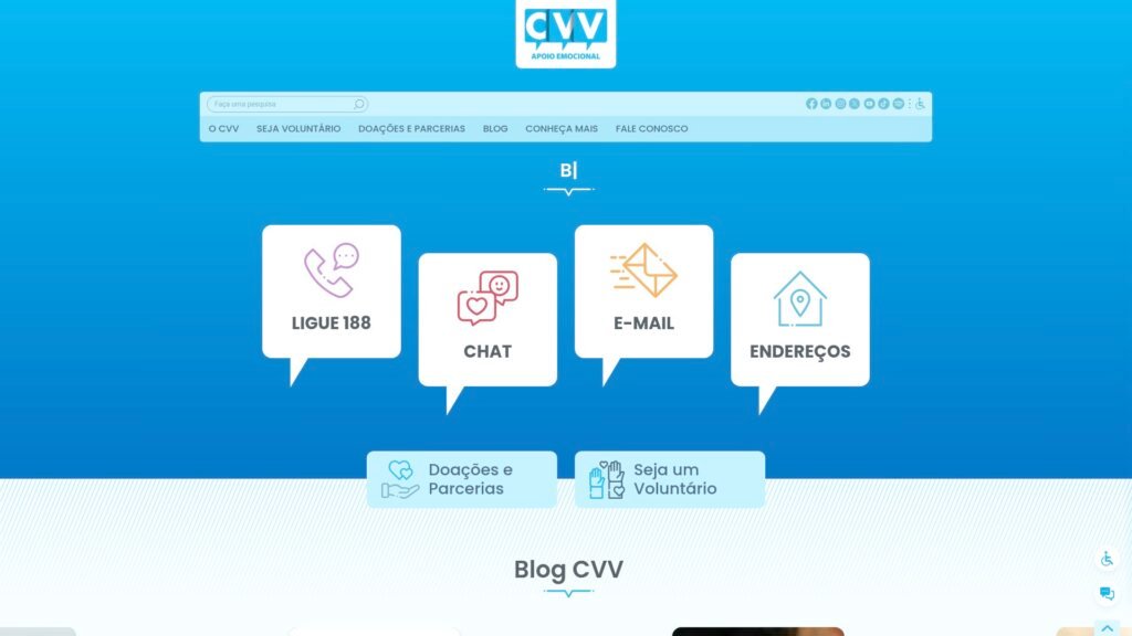 Descrição do site: O site CVV é o portal oficial do Centro de Valorização da Vida, uma organização sem fins lucrativos dedicada à prevenção do suicídio e ao apoio emocional. A plataforma apresenta informações sobre o trabalho do CVV, seus valores e a importância da escuta empática e sigilosa. No site, os visitantes encontram orientações sobre saúde emocional, materiais educativos e campanhas de conscientização. Também são destacados os canais de atendimento gratuitos, como telefone, chat e e-mail, disponíveis 24 horas por dia. O portal oferece informações para quem deseja se tornar voluntário e participar das atividades da instituição. A navegação é simples, acolhedora e voltada ao bem-estar do usuário. O site reforça a mensagem de solidariedade, respeito e cuidado com a vida. É uma referência nacional em apoio emocional e prevenção em momentos de crise.