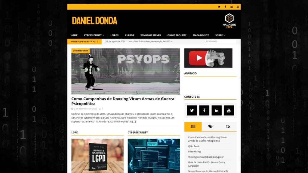Descrição do site: O site Daniel Donda funciona como um hub de referências sobre cibersegurança, educação em TI e carreira técnica. Nele, Daniel Donda apresenta seu histórico profissional de mais de 25 anos na área, com certificações e atuação como consultor, instrutor e fundador da Hackers Hive. Há informações sobre seus livros, artigos e diversos conteúdos educativos — desde guias sobre compliance e leis de proteção de dados até tutoriais técnicos e orientações de carreira em segurança da informação. O site também reúne posts recentes que abordam temas de vanguarda em cibersegurança, como threat-hunting, ataques a redes, análise forense digital, privacidade e conformidade. Ainda é possível encontrar menção a mentorias, cursos, podcasts e material de apoio para profissionais que buscam se especializar ou atualizar-se no campo. A página traz uma estrutura clara, com menus como “Sobre”, “Publicações”, “Educação” e “Mini-Currículo para Eventos”, facilitando a navegação e descoberta de conteúdo. Em suma, trata-se de uma plataforma voltada à disseminação de conhecimento técnico, formação e atualização contínua em segurança da informação, alinhada com os princípios de transparência e profissionalismo de seu autor.