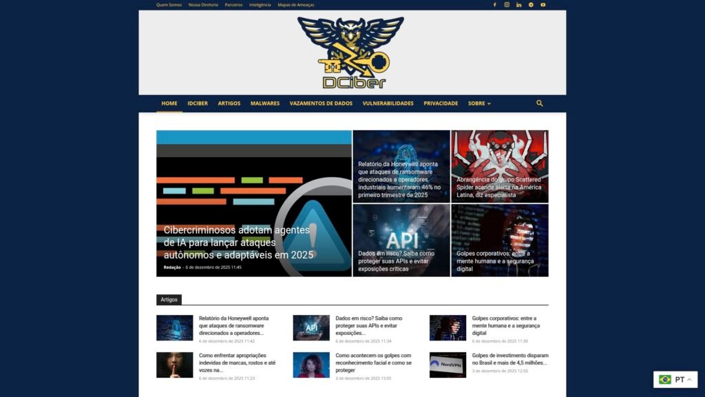 Descrição do site: O site DCiber se apresenta como um portal voltado à segurança cibernética, dedicado a informar e alertar sobre ameaças digitais, vazamentos, vulnerabilidades e proteção de dados, com foco em manter pessoas e organizações atualizadas. Com uma equipe de especialistas, o site oferece artigos, notícias e relatórios que abordam desde malwares, golpes e ataques, até vulnerabilidades, riscos de privacidade e impactos de novas tecnologias com ênfase na defesa cibernética. Há também uma preocupação clara com educação e conscientização: seu conteúdo visa ajudar leitores a entender os perigos do mundo digital e como se proteger, reforçando boas práticas e promovendo transparência, ética e profissionalismo. A navegação no site parece organizada em seções como “notícias”, “relatórios” e “alertas”, tornando acessível o acesso às diversas publicações. Em síntese, o DCiber é mais do que um veículo de notícias — é uma plataforma de informação e prevenção, focada em elevar o nível de segurança digital individual e organizacional, promovendo consciência sobre riscos e contribuindo para um ambiente online mais seguro.