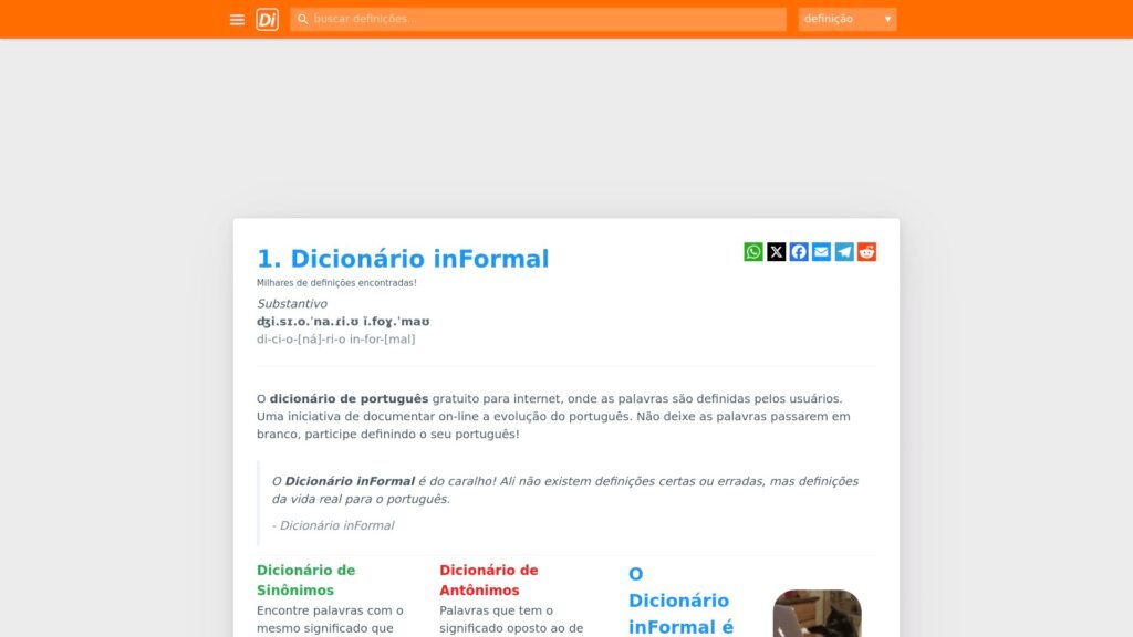 Descrição do site: O Dicionário Informal é uma plataforma online colaborativa que oferece definições de palavras e expressões do português, com foco na linguagem do dia a dia e gírias populares. Diferente dos dicionários tradicionais, o site permite que os próprios usuários contribuam com novas palavras e significados, criando um banco de dados dinâmico e constantemente atualizado. Além das definições, o site também disponibiliza exemplos de uso e pode esclarecer dúvidas sobre palavras menos conhecidas ou de difícil interpretação. É uma ferramenta útil para quem quer entender melhor as expressões informais, regionalismos e variações do idioma. A interface é simples e direta, facilitando a busca por palavras e tornando o site acessível para qualquer pessoa que precise de uma definição rápida e confiável.