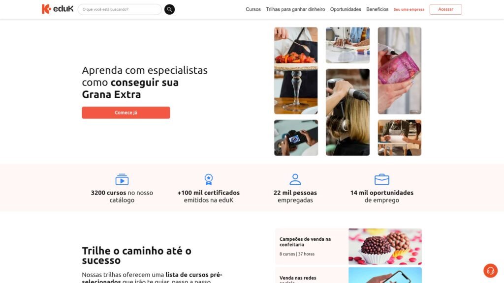 Descrição do site: O site da eduK é uma plataforma de ensino online voltada principalmente para quem deseja aprender novas habilidades práticas e gerar renda por meio do conhecimento adquirido. A proposta do serviço é oferecer cursos acessíveis e flexíveis, permitindo que o aluno estude a qualquer momento e de qualquer lugar, utilizando computador ou dispositivos móveis. A plataforma conta com um catálogo amplo, com mais de 3.200 cursos e tutoriais em diversas áreas. Os conteúdos são focados em áreas como gastronomia, confeitaria, artesanato, moda, beleza, fotografia e negócios, com forte apelo ao empreendedorismo e à criação de renda extra. As aulas são ministradas por especialistas do mercado e combinam vídeos, materiais complementares e atividades práticas, proporcionando um aprendizado mais aplicado ao dia a dia profissional. A eduK funciona por meio de assinatura, oferecendo acesso ilimitado aos cursos para os usuários cadastrados, além de períodos de teste gratuito para novos alunos. Outro destaque da plataforma são as trilhas de aprendizado, que organizam cursos em sequências estratégicas para ajudar o aluno a evoluir de forma estruturada e atingir objetivos específicos, como abrir um negócio ou melhorar suas vendas. Além do ensino, o site também busca conectar os alunos a oportunidades de trabalho e desenvolvimento profissional, incentivando a aplicação prática do conhecimento adquirido. Ao final dos cursos, os participantes podem obter certificados, que contribuem para a valorização do currículo. De modo geral, a eduK se apresenta como uma plataforma moderna e orientada ao mercado, focada em capacitação rápida, aprendizado prático e incentivo ao empreendedorismo, sendo uma alternativa interessante para quem deseja desenvolver habilidades e transformar conhecimento em fonte de renda.
