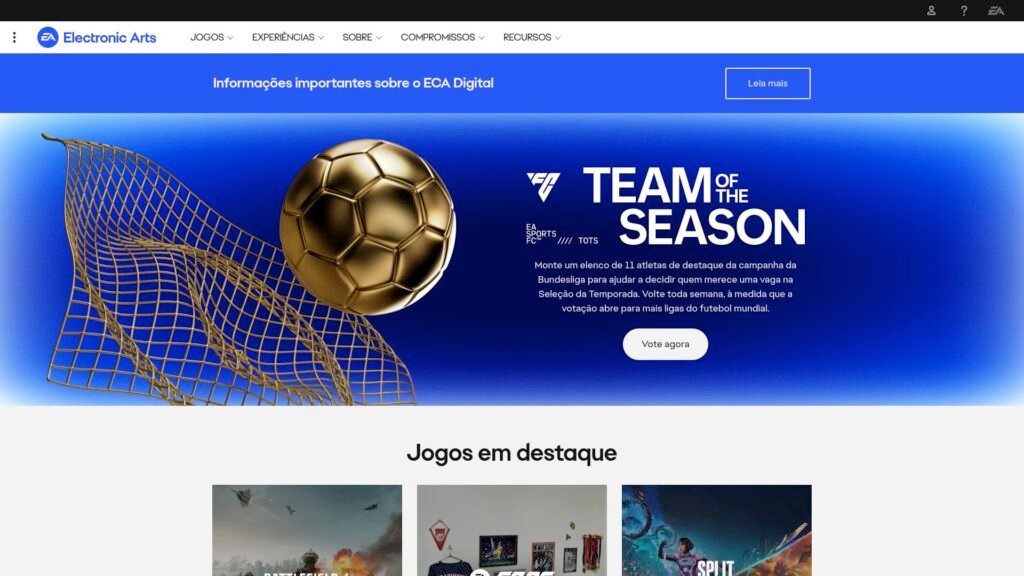 Descrição do site: O site da Electronic Arts é a plataforma oficial da empresa, funcionando como um hub completo para seus jogos, serviços e conteúdos digitais. A página reúne informações sobre os principais títulos da marca, incluindo franquias populares como EA SPORTS FC, Battlefield, The Sims e Apex Legends. Além disso, o site apresenta novidades, atualizações e notícias relacionadas aos jogos e à indústria de entretenimento digital. A plataforma também permite que os usuários explorem catálogos de jogos, acessem serviços por assinatura e encontrem conteúdos adicionais, como expansões e DLCs. Outro destaque é a integração com diferentes dispositivos, já que a empresa desenvolve jogos para consoles, PC e mobile, ampliando o alcance do seu ecossistema. O site inclui ainda áreas institucionais com informações sobre a empresa, carreira, cultura organizacional e iniciativas globais, reforçando sua posição como uma das líderes do setor de games. Também há seções de suporte ao jogador, onde é possível obter ajuda, gerenciar contas e resolver problemas técnicos. A interface é moderna e visualmente orientada, com navegação intuitiva que facilita o acesso a jogos, serviços e conteúdos relevantes. No geral, o site funciona como o ponto central da EA, conectando jogadores a experiências interativas, comunidades online e ao universo completo de seus produtos digitais.