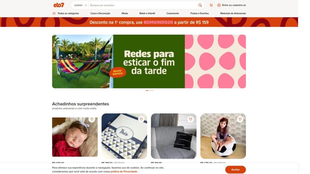 Descrição do site: O site Elo7 é um marketplace brasileiro focado em produtos criativos, artesanais e personalizados, onde artesãos, designers e pequenos empreendedores podem expor e vender seus itens diretamente para consumidores, com grande variedade de categorias como presentes, decoração, roupas e artigos feitos à mão. A plataforma funciona como um ponto de encontro entre compradores que buscam peças únicas e vendedores independentes, destacando-se pela personalização e contato direto entre as partes para ajustar detalhes de pedidos sob medida. Presentes exclusivos, lembrancinhas, peças decorativas e itens customizados compõem grande parte dos produtos disponíveis, e o site enfatiza a experiência humana e criativa por trás de cada oferta. Elo7 foi fundado com o objetivo de fomentar a economia criativa e ampliar o alcance de artesãos no comércio digital, sendo até comparado ao modelo internacional de marketplaces artesanais por sua proposta de valor. A navegação permite filtrar por categorias e estilos, possibilitando explorar um acervo extenso de itens que muitas vezes não estão presentes em lojas tradicionais. O site também destaca mecanismos de compra segura, proteção ao comprador e comunicação direta com o vendedor, o que fortalece a confiança no processo de aquisição de peças únicas. Graças à sua amplitude e foco na criatividade, Elo7 atrai milhões de visitantes interessados em produtos fora do comum, celebrando o trabalho artesanal e o comércio de nicho.