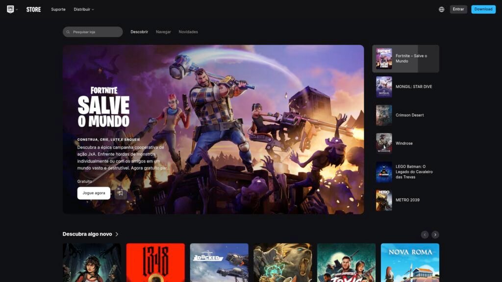 Descrição do site: O site da Epic Games Store é uma loja digital oficial voltada para a distribuição de jogos eletrônicos para PC, oferecendo tanto títulos pagos quanto gratuitos em um ambiente online integrado. A plataforma reúne um catálogo variado que inclui jogos independentes e grandes produções, além de conteúdos adicionais como DLCs e expansões. Um dos principais destaques do site é a oferta frequente de jogos gratuitos, disponibilizados semanalmente para os usuários resgatarem em suas contas. A navegação é organizada por categorias como destaques, lançamentos e promoções, com campanhas recorrentes que podem oferecer grandes descontos em diversos títulos. O site também permite a compra de saldo para a conta, que pode ser utilizado em diferentes produtos dentro da própria loja. Outro ponto importante é a integração com o launcher da Epic Games, onde os jogos adquiridos ficam disponíveis para download e gerenciamento em uma biblioteca digital. A plataforma conta ainda com recursos como lista de desejos, conquistas e sistema de amigos, ampliando a experiência social dos usuários. Além disso, a loja utiliza preços regionais e diversos métodos de pagamento, adaptando-se a diferentes países e perfis de usuários. De forma geral, o site se posiciona como uma alternativa moderna às lojas digitais tradicionais, com foco em acessibilidade, promoções frequentes e expansão contínua de recursos para jogadores e desenvolvedores.