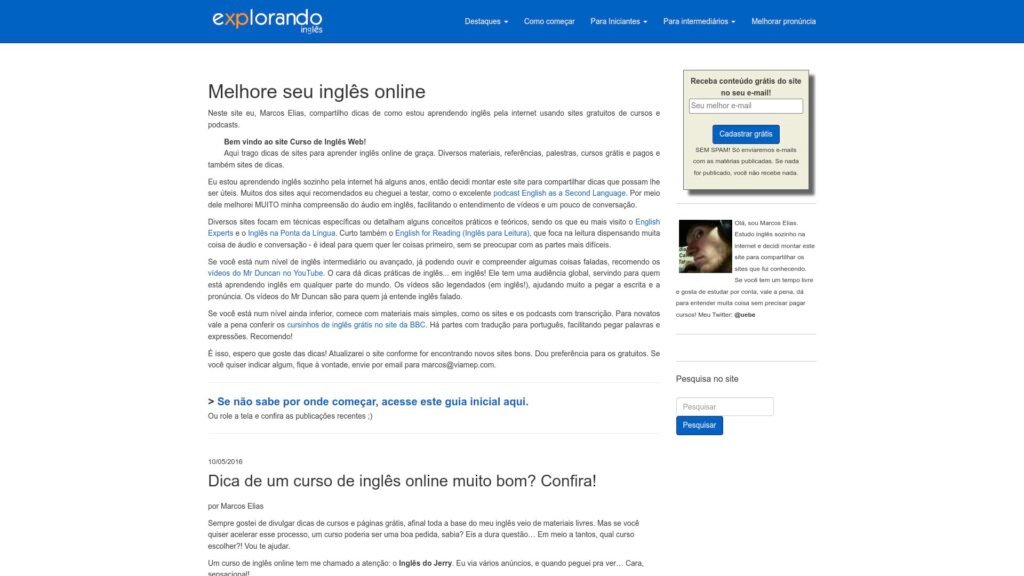 Descrição do site: O site Explorando Inglês oferece uma abordagem prática e acessível para quem deseja aprender ou aprimorar o inglês. Ele disponibiliza diversas ferramentas e recursos, como vídeos, artigos e exercícios interativos, que ajudam o usuário a desenvolver habilidades nas áreas de vocabulário, gramática, leitura e escuta. A plataforma se destaca por sua interface simples e intuitiva, tornando o processo de aprendizado mais fluido e dinâmico. Além disso, o conteúdo é estruturado de forma a atender tanto iniciantes quanto pessoas em níveis mais avançados, permitindo um progresso gradual. O site também proporciona uma maneira de estudar no próprio ritmo do aluno, oferecendo flexibilidade e autonomia.