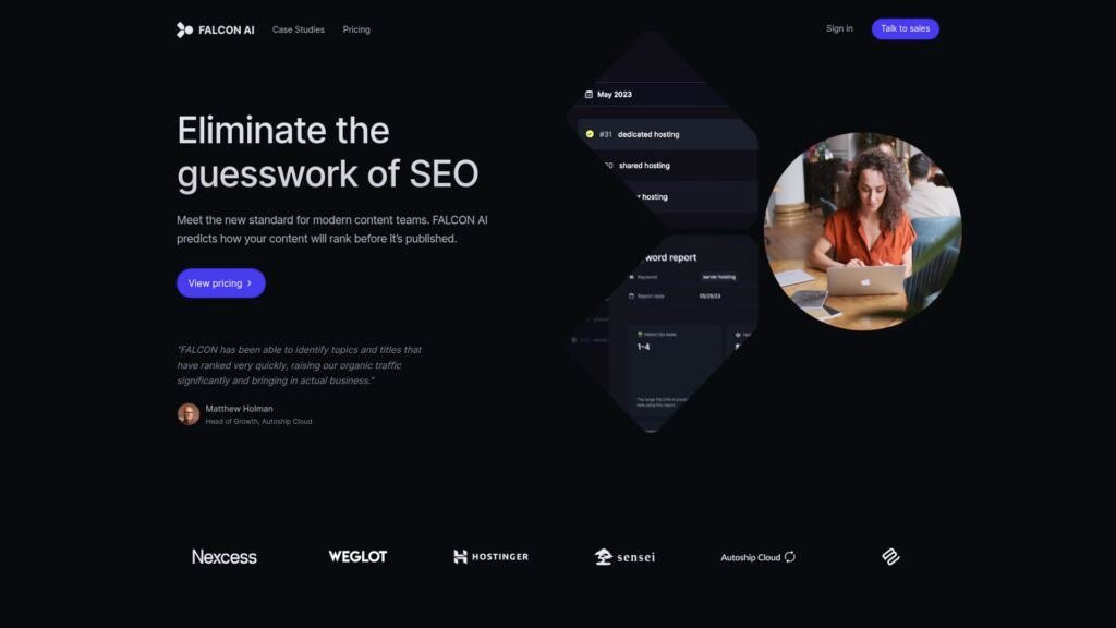 Descrição do site: Página oficial da ferramenta FALCON AI, uma plataforma de inteligência artificial voltada para prever o desempenho de conteúdos nos mecanismos de busca antes de sua publicação, ajudando equipes de marketing de conteúdo e SEO a eliminar a incerteza comum das estratégias tradicionais. Através de modelos de machine learning, o sistema analisa milhares de combinações de palavras-chave, títulos, descrições, temas, sentimento, extensão e tom de voz para sugerir as melhores opções que podem gerar maior visibilidade orgânica e engajamento em sites e blogs. A plataforma entrega relatórios detalhados e indicadores de ranking esperados, oferecendo um suporte mais analítico para decisões de conteúdo ao invés de simplesmente produzir textos automaticamente, focalizando na otimização estratégica que respeita diretrizes de qualidade de busca. Embora seja uma ferramenta paga com planos variados, seu foco principal é fortalecer o processo de criação de conteúdo para que a publicação tenha mais chances de alcançar posições elevadas nos resultados de pesquisa. O site também destaca estudos de caso e depoimentos de usuários que registraram aumentos significativos no tráfego e performance após usar o sistema, reforçando seu apelo para profissionais que desejam resultados previsíveis em SEO.