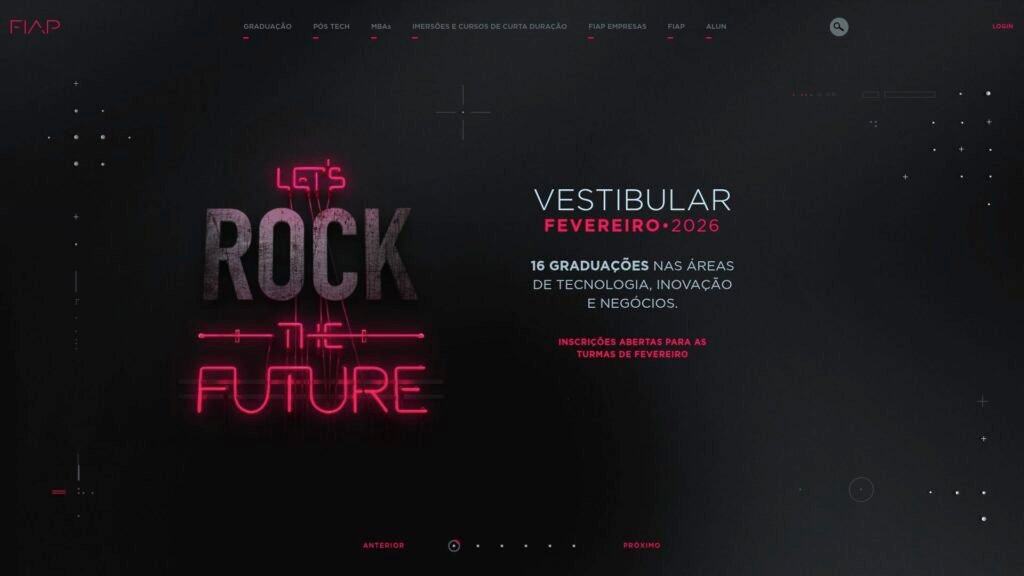 Descrição do site: O site da FIAP é voltado para apresentar informações sobre seus cursos e programas educacionais, com ênfase em áreas como tecnologia, negócios e inovação. Ele destaca a instituição como uma das principais no Brasil, reconhecida pela qualidade de seus cursos de graduação, pós-graduação e MBA, além de sua atuação em pesquisa e desenvolvimento. A FIAP se posiciona como um centro de formação de profissionais preparados para os desafios do mercado digital, com programas focados em temas como inteligência artificial, big data, cibersegurança, entre outros. O site também oferece detalhes sobre parcerias com empresas de tecnologia e eventos acadêmicos, reforçando seu compromisso com a prática e o aprendizado constante. Além disso, é possível acessar informações sobre os processos seletivos, infraestrutura e benefícios para os alunos.