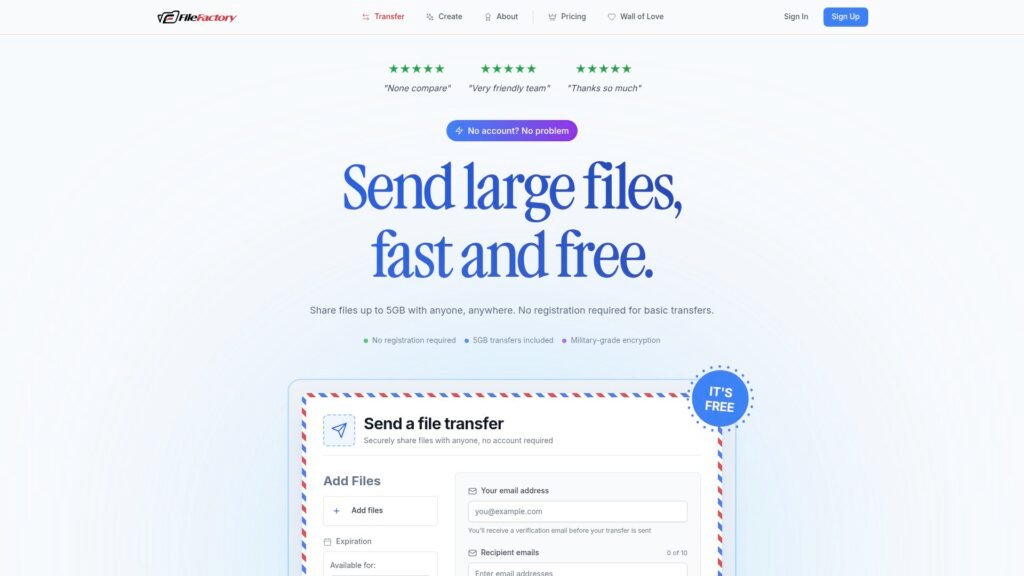 Descrição do site: O serviço FileFactory permite o envio direto de arquivos de até 5 GB diretamente para caixas de entrada, sem complicações ou anúncios intrusivos. Ele combina simplicidade e profissionalismo, ideal para freelancers, criadores e qualquer pessoa que precise compartilhar documentos grandes de modo prático e seguro. Dependendo do plano, usuários gratuitos ou anônimos têm limites menores na quantidade total de dados por envio, enquanto contas premium permitem transferências maiores — até 200 GB por envio. Todo o fluxo privilegia usabilidade, com interface limpa, suporte a múltiplos arquivos em um único envio e mecanismos para proteger conteúdos. A ferramenta evita etapas desnecessárias, priorizando rapidez e transparência no processo de compartilhamento, com rastreamento da transferência e opções de controle sobre o acesso. Feedbacks de usuários apontam que, embora já tenha sido bastante valorizado, recentemente surgiram críticas sobre estabilidade e funcionamento irregular. Em essência, o FileFactory é uma solução voltada ao envio eficiente de arquivos grandes, dentro de limites e recursos que variam conforme a modalidade de conta escolhida.