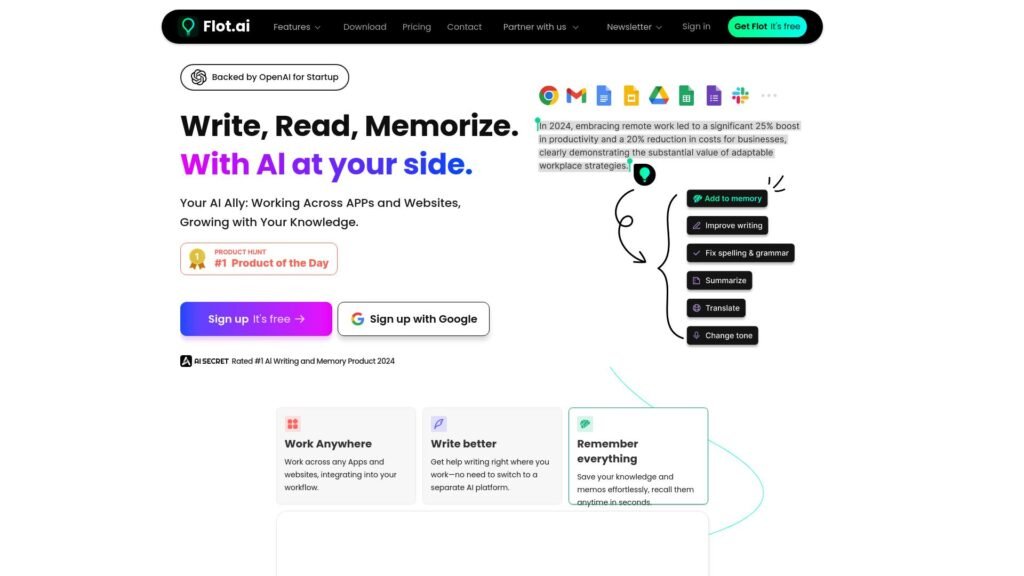 Descrição do site: O site Flot.ai apresenta uma ferramenta de inteligência artificial concebida para atuar como um copiloto universal de texto, integrando-se diretamente a praticamente qualquer aplicativo, documento ou página da web em que o usuário esteja escrevendo ou interagindo, sem necessidade de copiar e colar o conteúdo. A proposta central é facilitar tarefas de escrita, leitura e organização de informações, oferecendo correção gramatical, reformulação de frases, resumos, traduções e respostas contextuais com um clique, aproveitando tecnologia como GPT-4. A plataforma funciona tanto em sistemas Windows e macOS quanto em aplicações móveis, suportando mais de 200 idiomas e permitindo que profissionais, estudantes e criadores de conteúdo mantenham sua produtividade sem sair de seu fluxo de trabalho. Flot.ai também promete recursos de “memória” que ajudam a salvar e recuperar notas, links ou trechos importantes para referência futura. Apesar de ser promovido como uma solução poderosa de assistência em texto e produtividade, usuários relatam experiências variadas quanto à usabilidade e modelo de cobrança, incluindo versões de teste e planos pagos.