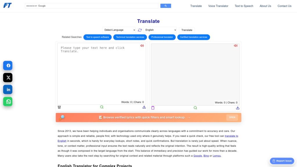 Descrição do site: O site FreeTranslations é uma plataforma online que oferece serviços de tradução automática e profissional para textos em vários idiomas, permitindo que usuários obtenham traduções rápidas de palavras, frases ou textos mais longos diretamente no navegador com simplicidade e sem custos iniciais. Apesar de fornecer uma ferramenta gratuita útil para compreender o “gist” de um conteúdo em língua estrangeira, o foco do site também está em serviços pagos mais elaborados realizados por tradutores humanos, especialmente quando nuance, contexto ou terminologia técnica são importantes. A página combina a praticidade das traduções automáticas com a opção de revisões e projetos personalizados feitos por profissionais experientes, ajudando tanto indivíduos quanto empresas a se comunicarem internacionalmente. A interface é direta, voltada para quem precisa de uma tradução instantânea, mas a equipe por trás do serviço também presta suporte e trabalha para garantir precisão e adequação cultural em textos mais complexos. Em essência, o FreeTranslations serve como ponto de partida para traduções simples e como porta de entrada para soluções linguísticas mais robustas quando necessário.