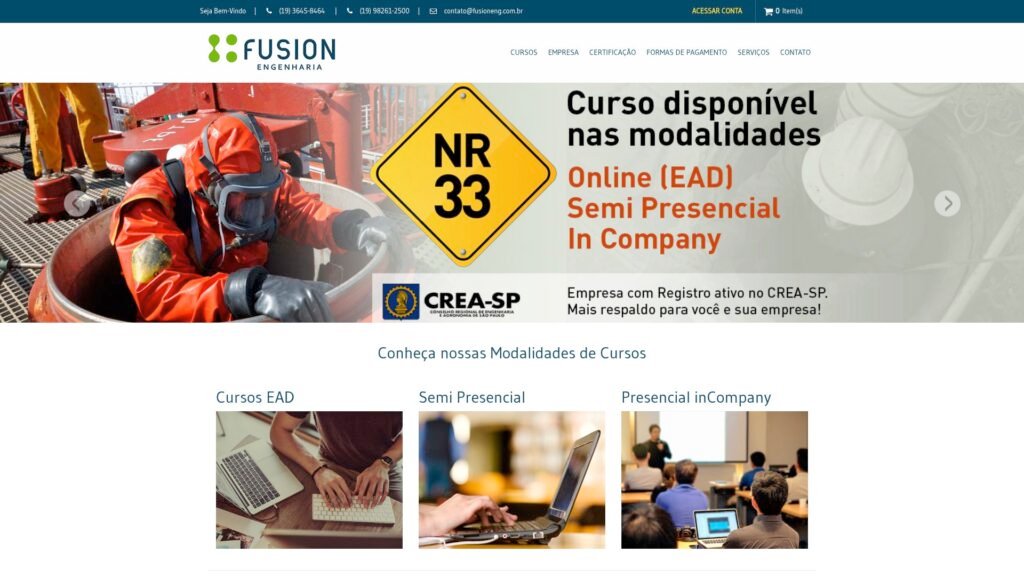 Descrição do site: O site da Fusion Engenharia é uma plataforma institucional e educacional voltada à oferta de cursos e treinamentos na área de segurança do trabalho, com foco principal nas Normas Regulamentadoras (NRs) exigidas no ambiente profissional. A empresa foi fundada em 2009 por uma equipe de engenheiros e especialistas técnicos, com o objetivo de capacitar profissionais e empresas por meio de conteúdos atualizados e alinhados às exigências legais. A plataforma disponibiliza cursos em diferentes formatos, como ensino a distância (EAD), semipresencial e treinamentos presenciais in company, oferecendo flexibilidade para atender tanto alunos individuais quanto empresas. Entre os cursos oferecidos estão treinamentos como NR-10, NR-35, NR-33, direção defensiva, primeiros socorros e outros relacionados à segurança e saúde no trabalho. Os cursos são estruturados com conteúdos teóricos e, em alguns casos, etapas práticas supervisionadas, garantindo uma formação mais completa e aplicável ao ambiente profissional. Ao final, os alunos realizam avaliações e, atingindo o desempenho mínimo exigido, recebem certificado válido em todo o território nacional. Além da área educacional, o site também apresenta serviços técnicos como elaboração de laudos, programas de segurança (PPRA, PCMAT) e acompanhamento de atividades com foco na prevenção de riscos. A plataforma ainda oferece suporte ao aluno, opções de pagamento facilitadas e acesso contínuo ao conteúdo após a matrícula. De modo geral, a Fusion Engenharia se posiciona como uma empresa especializada em capacitação técnica e segurança do trabalho, oferecendo soluções educacionais e serviços profissionais voltados à conformidade com normas e à qualificação no mercado industrial.
