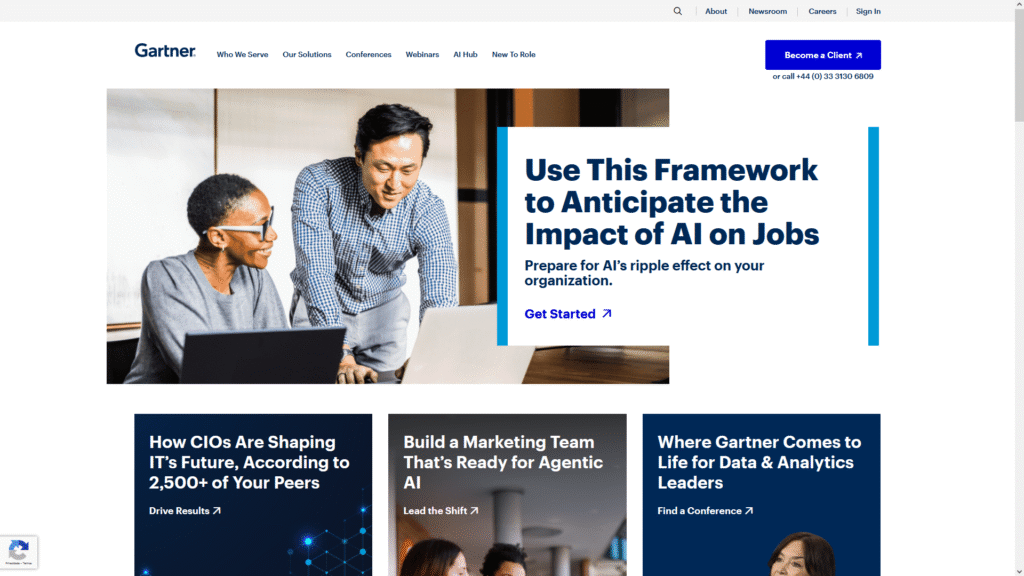 Descrição do site: A Gartner é uma das mais influentes empresas globais de pesquisa e consultoria em negócios e tecnologia. Nele, executivos encontram estudos, relatórios e ferramentas para tomar decisões estratégicas, usando dados confiáveis para planejar iniciativas críticas. A plataforma oferece insights sobre transformação digital, inteligência artificial, cadeias de suprimento e inovação, reunindo uma vasta equipe de analistas especializados. Além de conteúdo analítico, a Gartner propõe consultorias customizadas para alinhar investimentos em TI com os objetivos de cada organização. Também há recursos para benchmarking, frameworks de avaliação e previsões de mercado que ajudam as empresas a se manterem à frente. A página dá acesso a eventos globais, conferências e comunidades de líderes, possibilitando trocas valiosas entre pares. A independência editorial da Gartner é destacada como pilar essencial para a credibilidade de seus estudos. Por fim, o site tem áreas para clientes solicitarem suporte, assinarem serviços de pesquisa ou contratar consultoria.