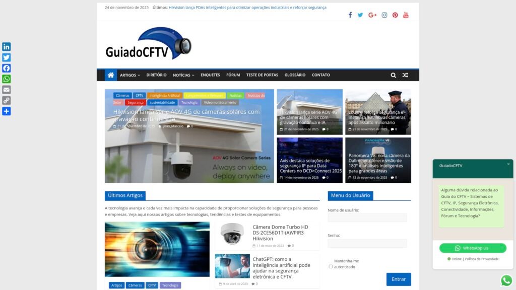 Descrição do site: O site Guia do CFTV é um portal especializado em segurança eletrônica, dedicado a oferecer conteúdo técnico e prático sobre sistemas de vigilância por vídeo (CFTV). Ele reúne artigos, tutoriais, comparativos e análises de equipamentos como câmeras, DVRs/NVRs, fontes e cabeamento, com uma linguagem acessível para iniciantes e também relevante para profissionais. Na seção “Quem Somos”, é explicado que o site foi criado por Edimilson Santos, com o objetivo de democratizar o conhecimento sobre instalação e manutenção de CFTV. Há orientações claras para quem deseja montar projetos de vigilância, desde a escolha dos componentes até a manutenção preventiva e a compactação de vídeo. Além disso, o portal mantém um fórum ativo onde usuários e técnicos discutem dúvidas específicas — desde cabeamento até legislação e normas técnicas. Também são cobertas tendências, como automação residencial, IoT e reconhecimento facial, relacionados à segurança. O Guia de CFTV enfatiza a transparência e honestidade em suas recomendações, sem patrocínios disfarçados, buscando sempre educar. Ele funciona como uma ponte entre tecnologia de vigilância e usuários que querem montar sistemas confiáveis e bem dimensionados.
