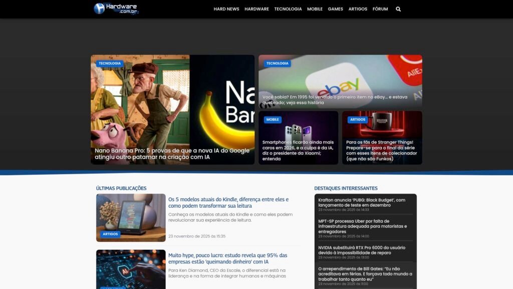 Descrição do site: O site Hardware é um portal brasileiro de tecnologia bastante consolidado, dedicado a publicar notícias, análises e tutoriais sobre hardware, gadgets, games e software. Fundado em 1999, ele mistura conteúdo técnico de alta qualidade com uma comunidade engajada de entusiastas e profissionais de TI. No site, há matérias sobre lançamentos, comparativos de componentes e dicas para quem quer montar ou otimizar seu computador. Além do conteúdo editorial, o Hardware mantém um fórum ativo onde usuários trocam experiências, tiram dúvidas e debatem tendências tecnológicas. A plataforma também permite que lojistas de peças e serviços criem suas lojas dentro do próprio site, ampliando sua utilidade comercial. A equipe interna produz regularmente vídeos, unboxings, reviews e artigos aprofundados, o que contribui para seu alcance — segundo a Ramar Ventures, cerca de 2 milhões de pessoas acessam o portal mensalmente. A linguagem do site é acessível, ainda que voltada para um público que realmente valoriza conhecimento técnico, e o layout equilibra bem conteúdo editorial com espaços para comunidade e comércio.